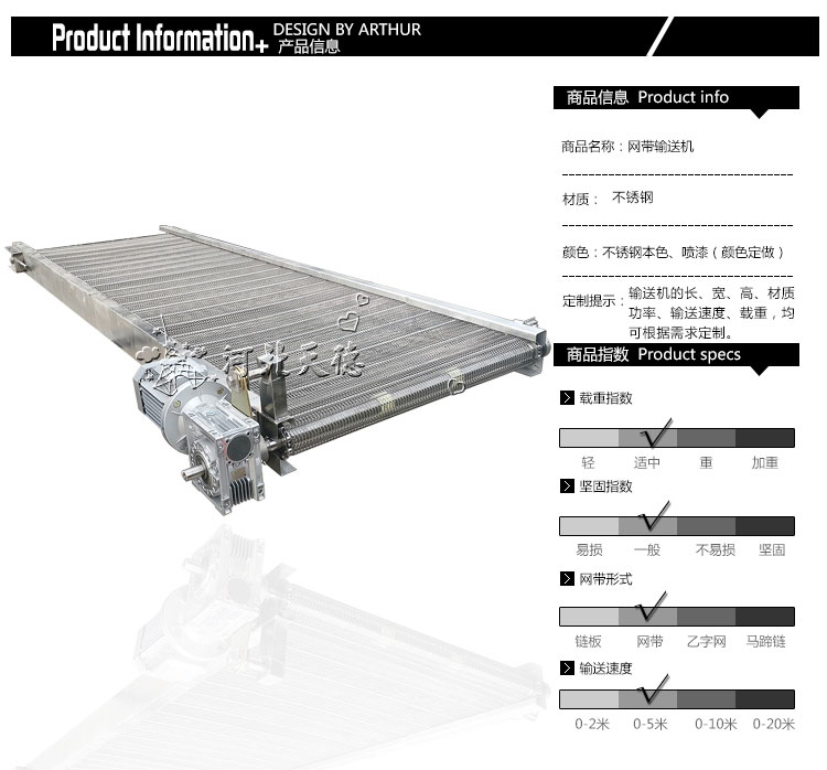 該輸送機用于物料的輸送。采用不銹鋼網帶作為載體,適用于各種食品行業的烘干、去濕、冷凍等、熱處理等;不銹鋼制成,具有耐高溫、便于清洗等特點。輸送機應用行業:食品、冶金、電力、煤炭、化工、建材、碼頭、糧食等。